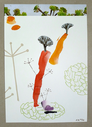 In meiner Collagen Serie habe ich eigene Fotos aus dem Darmstädter Botanischen Garten mit Malerei und Stempeln kombiniert. Speziell die Formenvielfalt der Pflanzen in den Gewächshäusern, hat mich zu den Kompositionen inspiriert.